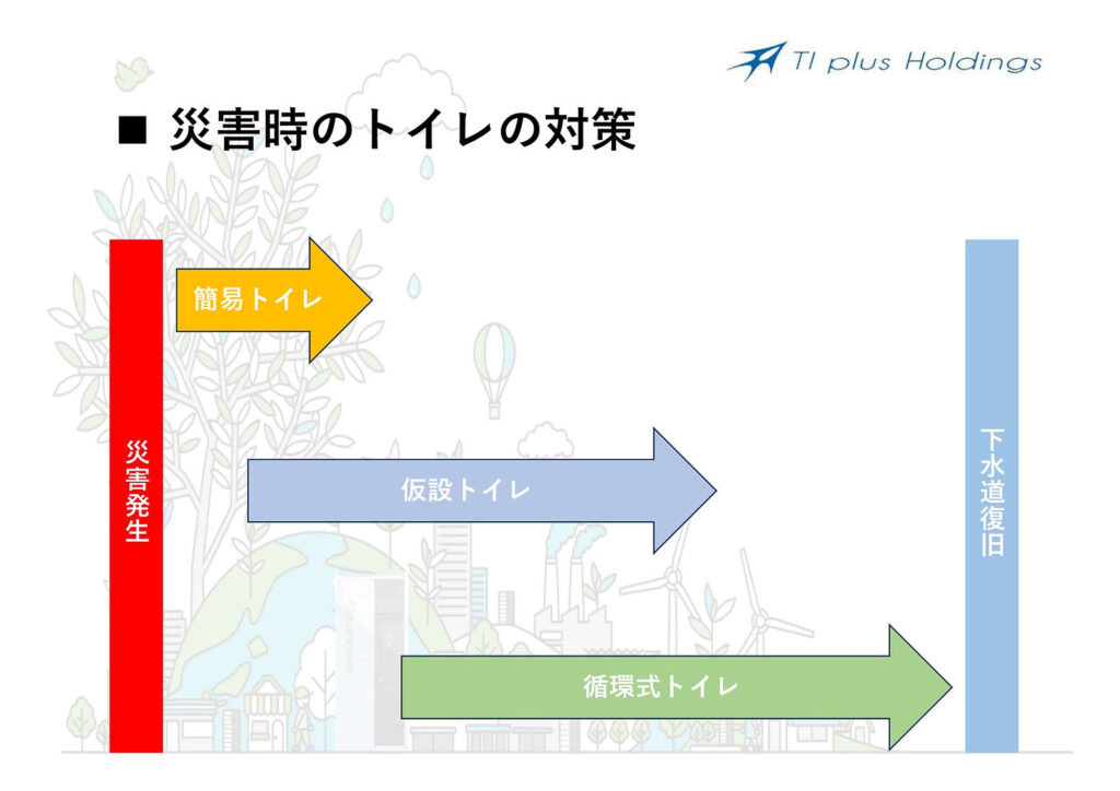 災害発生時から下水道が復旧するまでにはかなりの時間を要します。 様々な課題が発生するため、段階的なトイレ対策が必要だと考えます。